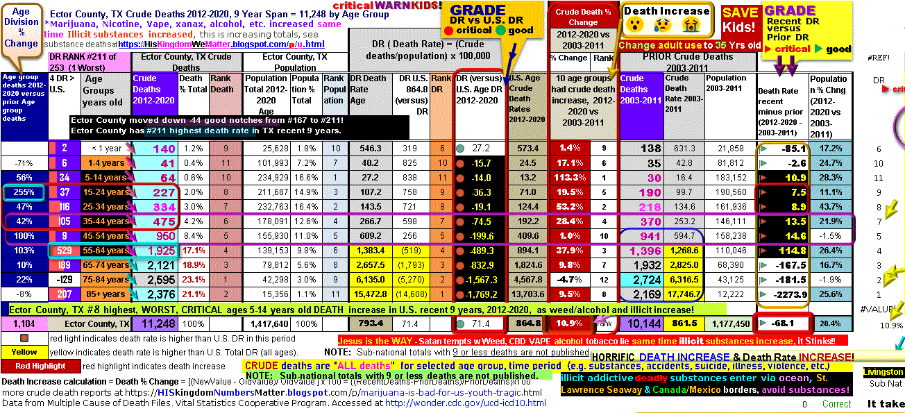Texas has 38th highest WORST, ages 15-34 years old death rate, 36th highest death increase in U.S. recent 7 years (#1 is worst). https://hiskingdomnumbersmatter.blogspot.com/p/warn-kids-addictive-deadly-illicit.html